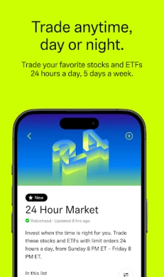 There are additional, unique risks with trading outside of regular market hours you should be aware of before making an investment decision, including the risk of lower liquidity, increased volatility, greater spreads, and pricing uncertainty. Robinhood 24 Hour Market is from Sunday 8 PM ET - Friday 8 PM ET.